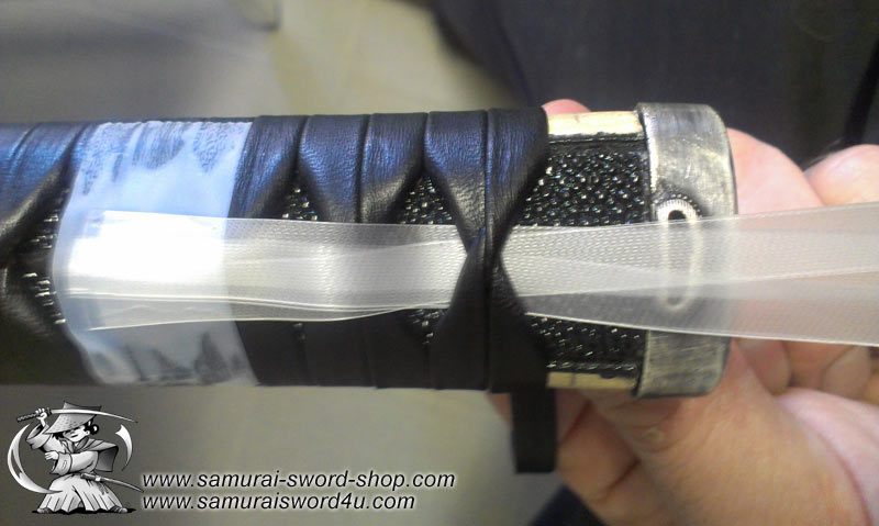 La qualité de la peau de raie n’est pas si mauvaise, il est juste un peu dommage qu’ils aient placé le joli nod aussi haut sur le tsuka. Vous pouvez voir ici un exemple typique de hishigami «Chinois». De très fins morceaux de papier qui ne feront aucune différence au moment du tressage.