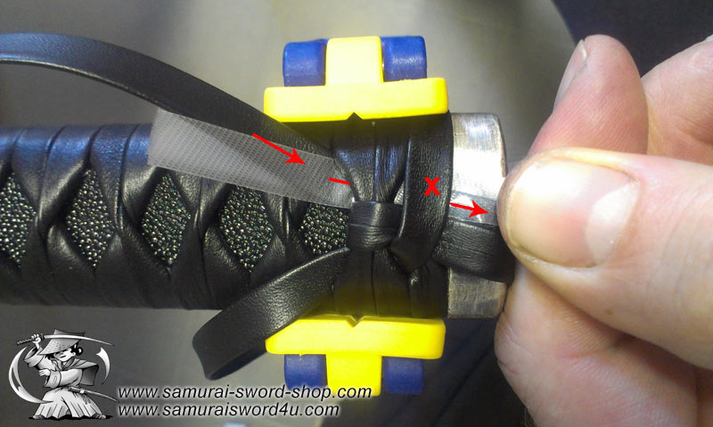 Prenez le ito sur le côté gauche du tsuka maintenant, et tirez-le sous le morceau venant de la partie droite et sous le losange